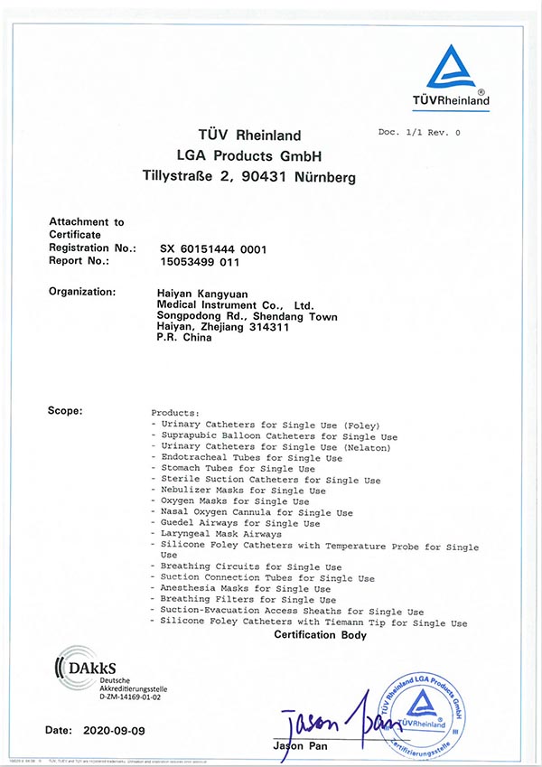 Kangyuan integrates R&D, production and sales, focuses on the innovation of disposable and reusable medical consumables in polymer materials, has developed a full range of products mainly in the fields of urology, anesthesiology and pneumatology, and gastroenterology. The main products are: various Silicone Foley Catheters, Silicone Foley Catheter with Temperature Probe, Suction-Evacuation Access Sheath for Single Use, Laryngeal Mask Airway, Endotracheal Tubes, Suction Catheter, Breathing Filter, Oxygen Mask, Anesthesia Mask, Stomach Tube, Feeding tube etc. Kangyuan has passed ISO13485 quality system certification, products has passed EU CE certification and US FDA certification.